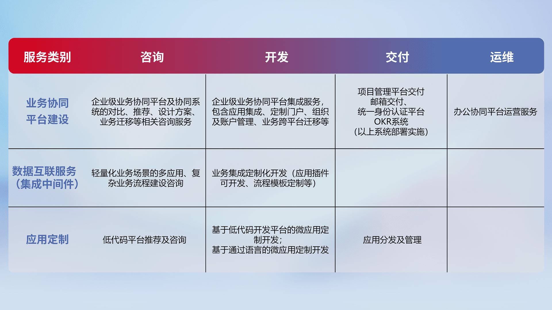针对钉钉、、、企微、、、IDaas等平台级产品提供产品的规划、、方案、、、交付、、、、定制化开发等服务,,,实现如统一协同办公、、、、智能客户服务、、、混合会议管理、、智能数据查询、、、等业务场景,,实现数字化转型。。。。